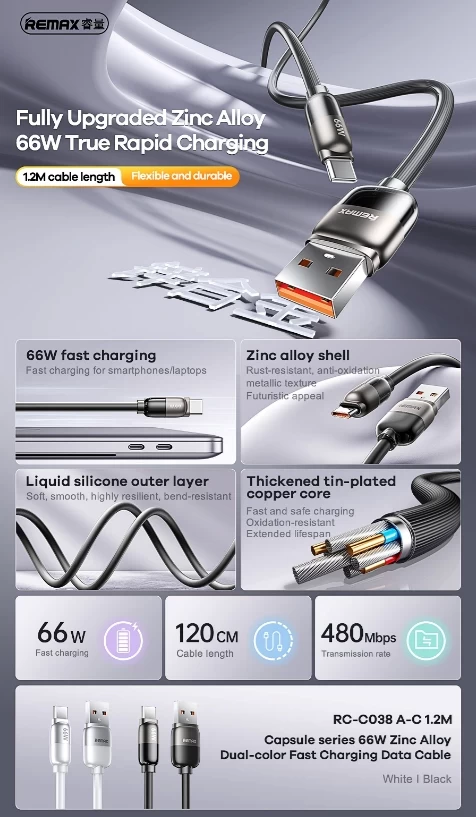 Capsule 66W zinc alloy fast charging dual-color data cable