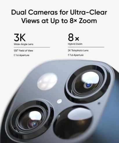 • Enhanced Dual-Camera Clarity at 50 Feet: Capture every event that occurs around your home in ultra-clear 3K resolution. See exactly who is approaching your home with 8× zoom. Note: The max resolution will be 2K when using AI Tracking or Dual Views.