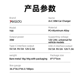 Yesido Y68 PD30W+QC18W Fast Charging Car Charger